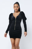 SOFT VELVET PLEATED PUFF SLEEVE LOW V NECK FRONT AND BACK MINI DRESS WITH GOLD ACCENT ZIPPER IN FRONT AND BACK TIE AROUND NECK
